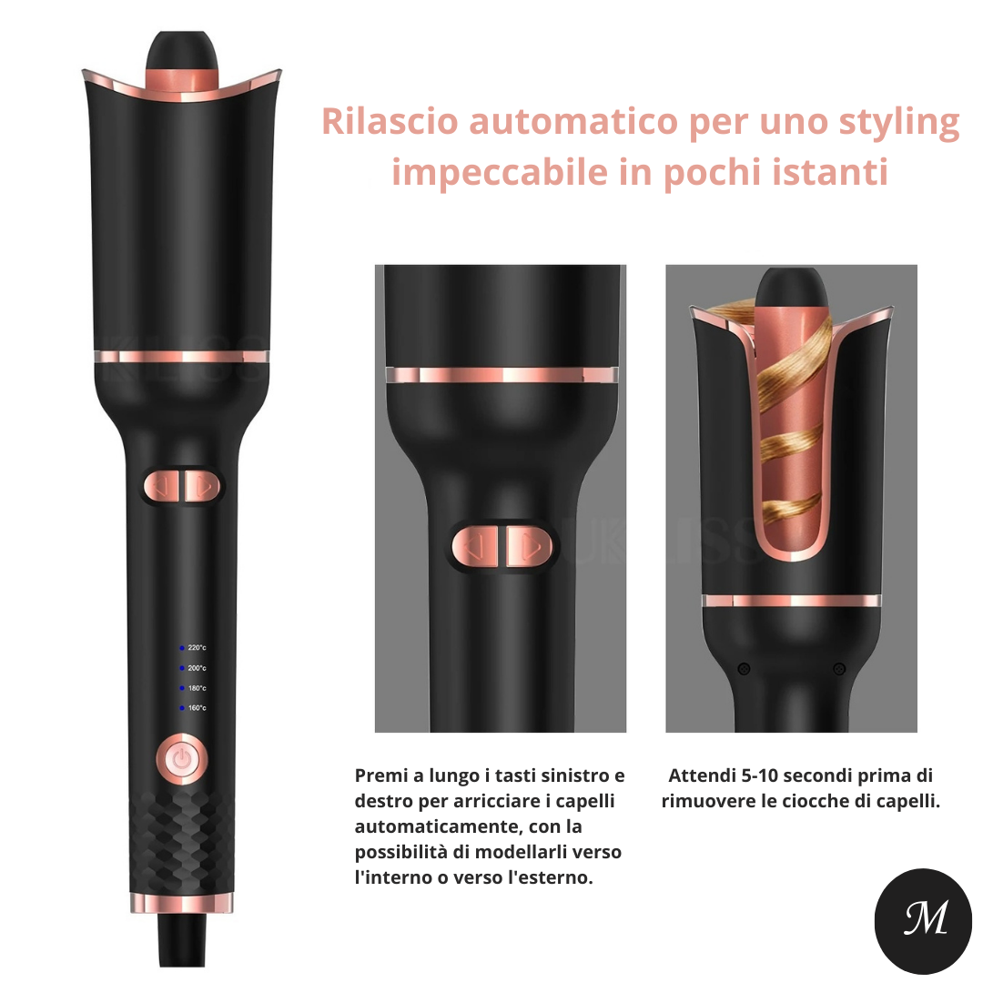 Basta inserire una ciocca nell’apertura: il sistema avvolge automaticamente i capelli, li riscalda in modo uniforme e rilascia un riccio definito in pochi secondi.